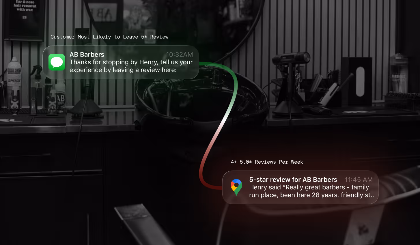 AB Barbers got nine, 5.0 star Google reviews in a single week and consistently get 4 to 5 reviews per week through our intelligent, personalised notifications. Now they are ranked higher on Google and get more new customers.